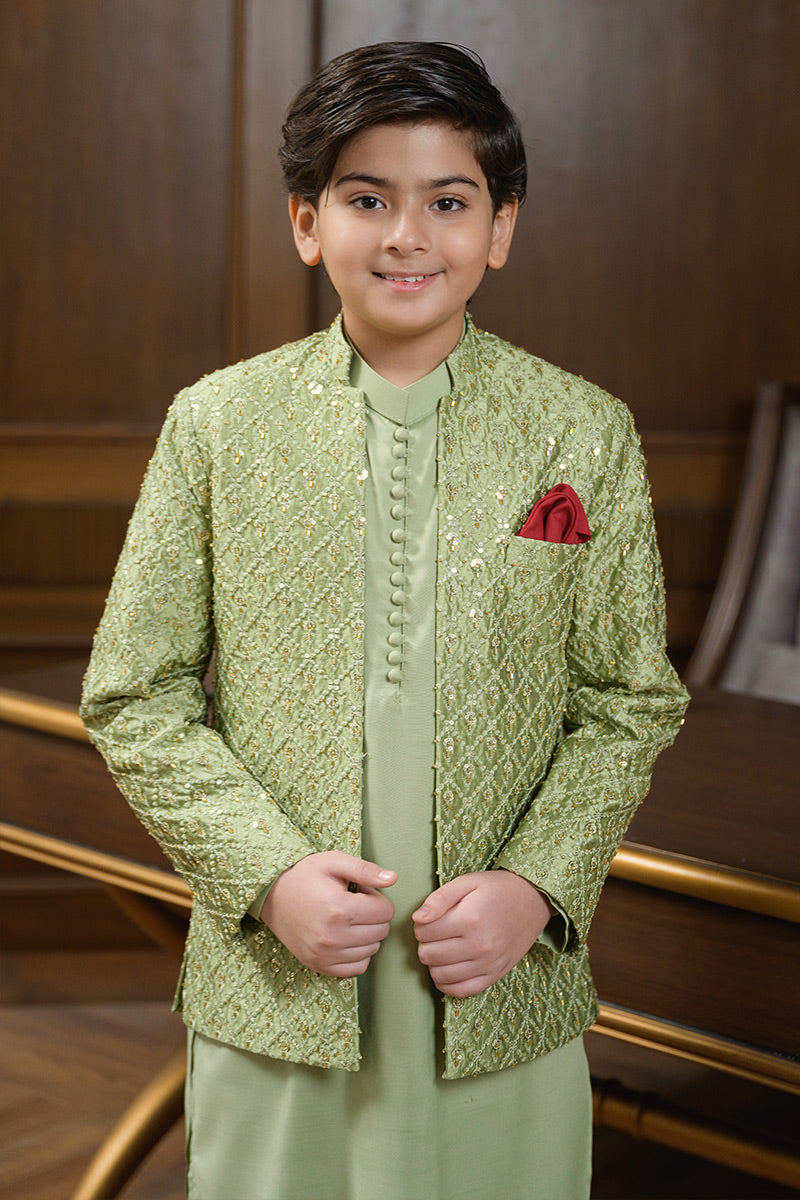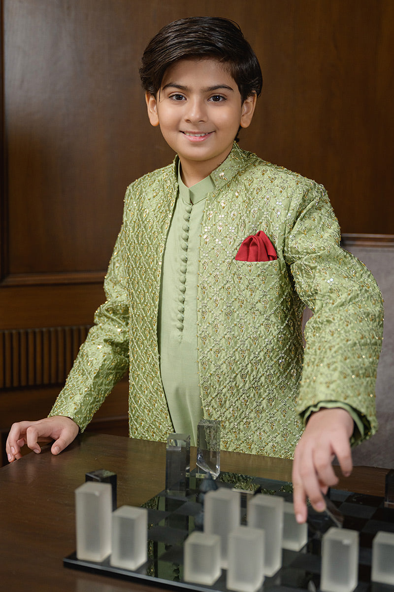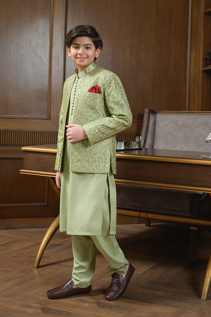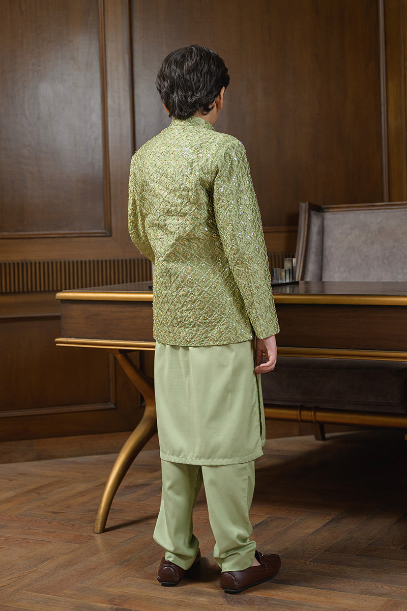 Step into refined elegance with this pistachio green ensemble featuring a hand-embellished and embroidered raw silk prince coat layered over a wrinkle-free poly cotton shirt, paired with matching wrinkle-free poly cotton pants. The prince coat is crafted with intricate detailing that elevates the look, making it a sophisticated choice for festive occasions, formal gatherings, and evening wear.