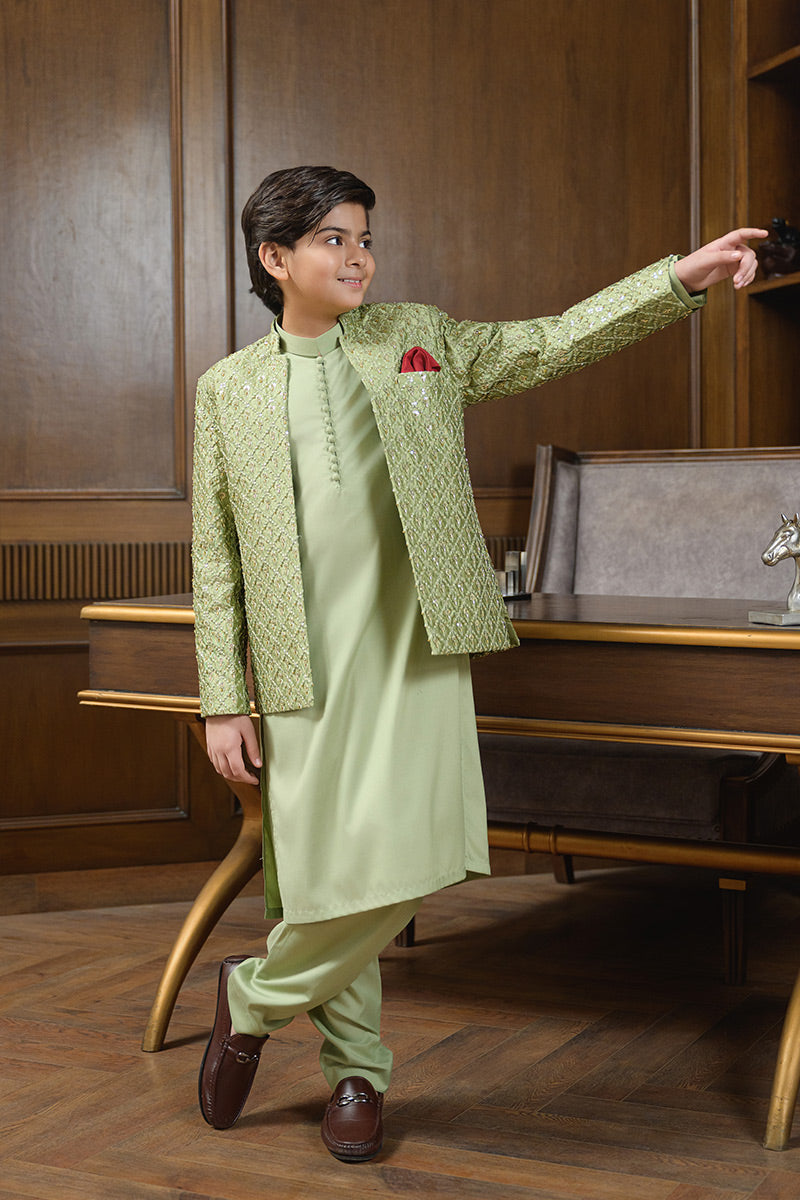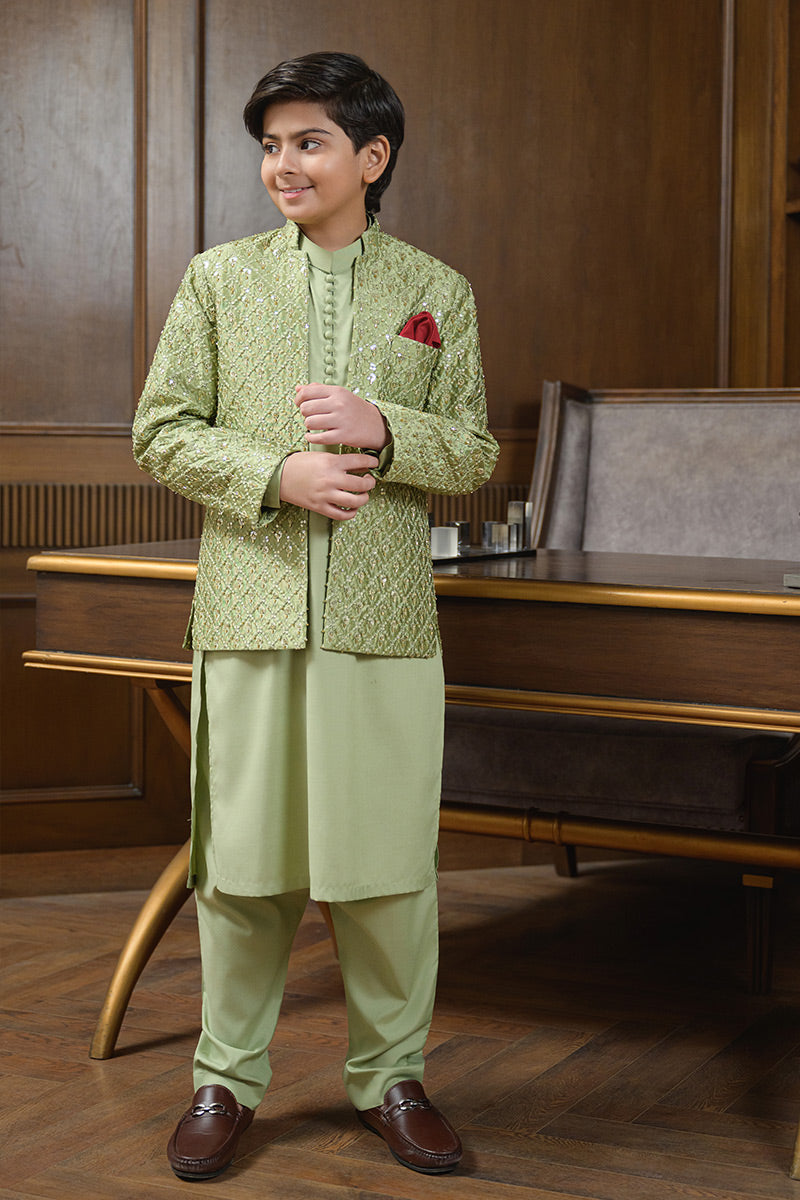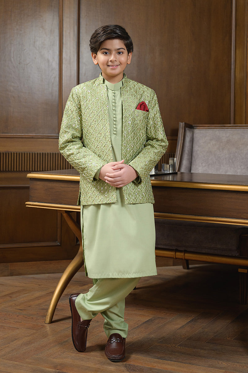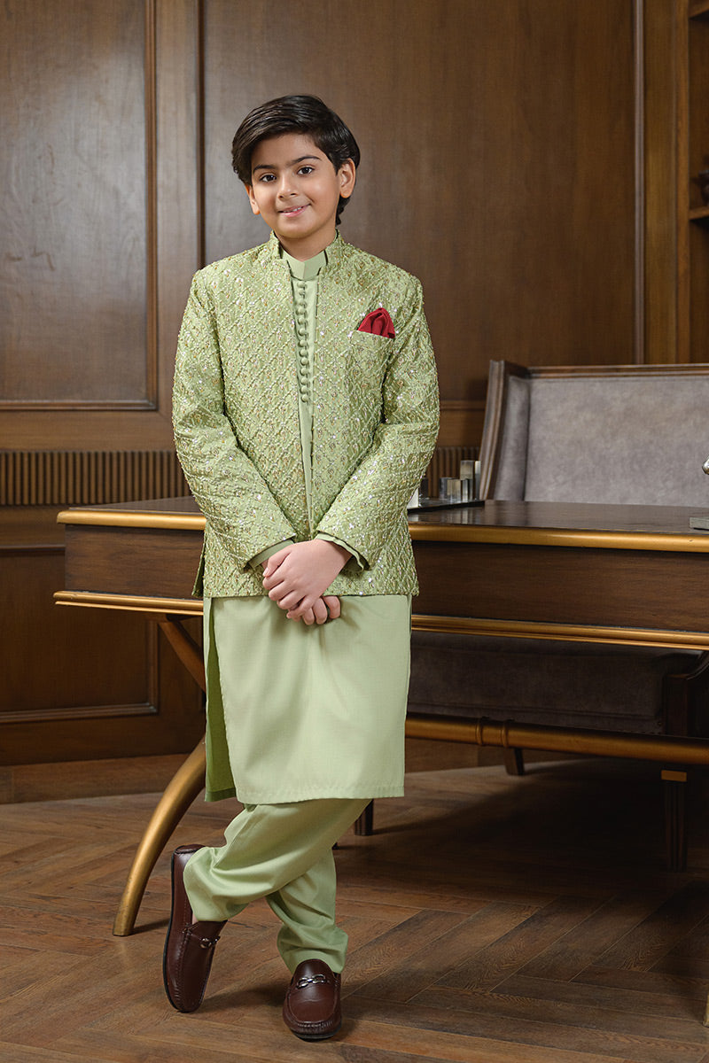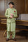 Step into refined elegance with this pistachio green ensemble featuring a hand-embellished and embroidered raw silk prince coat layered over a wrinkle-free poly cotton shirt, paired with matching wrinkle-free poly cotton pants. The prince coat is crafted with intricate detailing that elevates the look, making it a sophisticated choice for festive occasions, formal gatherings, and evening wear.