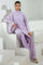 Crafted in a gentle, subtle lavender shade and made from crush fabric, this silhouette boasts a lovely A-line cut with an elegant high-neck design featuring bow details that add a fresh and flowing touch. It is adorned with a scattering of pearls and elegantly styled with flared sleeves and pants, creating an ideal daytime ensemble.