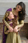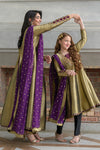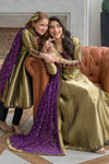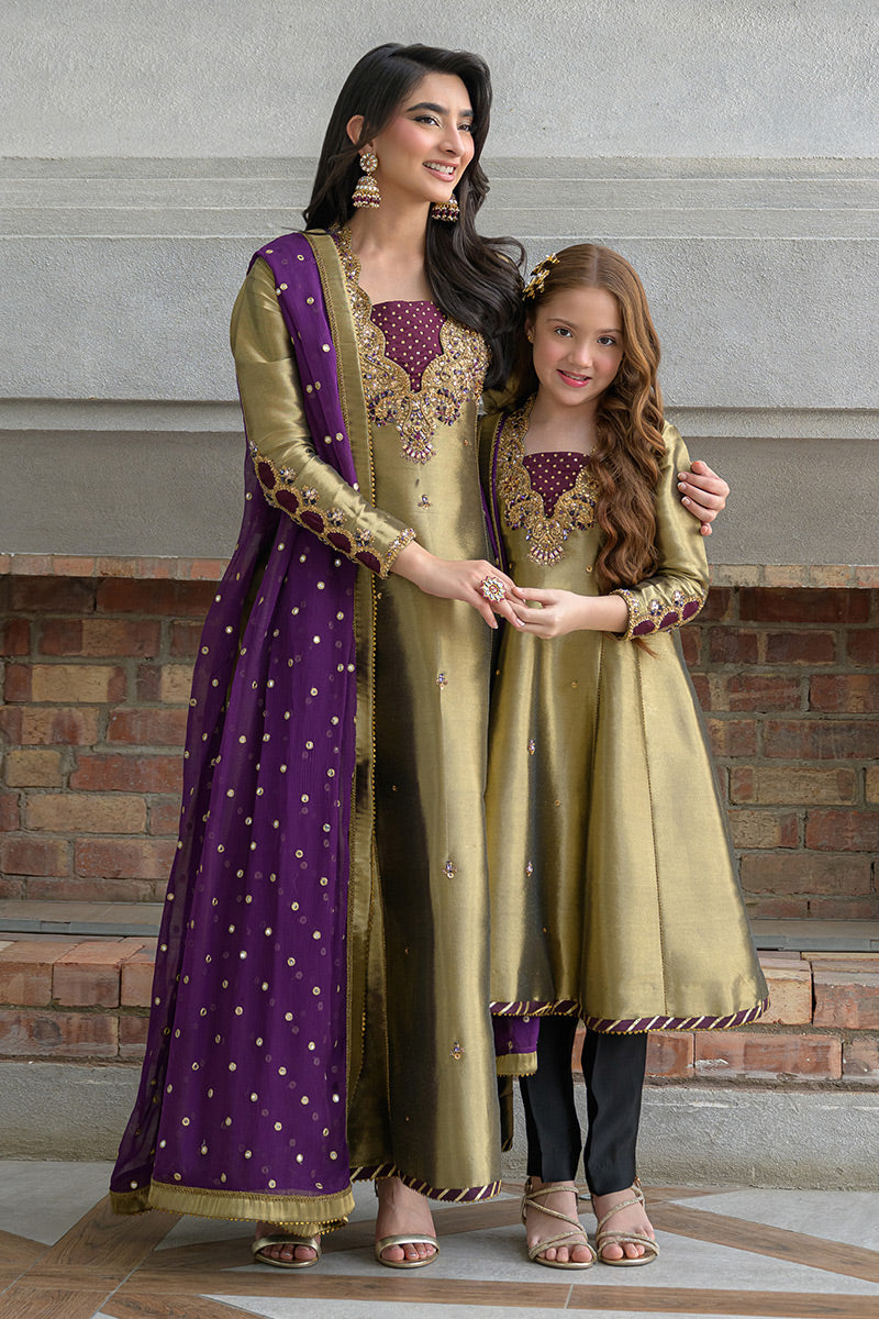 Shine in this exquisite metallic gold-black ensemble, featuring a long kalidar frock paired with straight capri pants and a rich brinjal plum booti chiffon dupatta. Crafted from pure lama silk, the frock is adorned with intricate handwork of stones, gems, zardozi, resham embroidery, and shimmering sequins, creating a luminous and regal appeal. The contrasting plum dupatta adds depth and elegance—perfect for festive occasions
