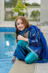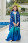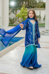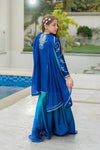 A refreshing blend of electric blue and soft sea blue tones, this vibrant ensemble features a short shisha silk shirt paired with flared ombré peplum pants and a graceful medium silk dupatta. The shirt is delicately hand-embellished with resham embroidery, gemstones, dabka, and pearls, creating a refined yet playful charm. The dupatta is finished with elegant lace detailing, adding a soft feminine touch—perfect for festive moments and celebrations.