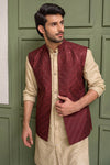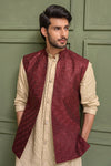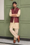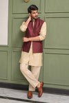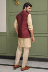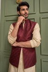 Step into timeless sophistication with Caramel Wine, featuring a maroon waistcoat crafted in embroidered raw silk and enhanced with delicate sequin detailing. Layered over a beige gold front-open raw silk kurta adorned with intricate sequin embroidery, this ensemble is paired with straight pants in wrinkle-free poly cotton fabric. A harmonious blend of rich hues and fine craftsmanship, perfect for festive occasions, weddings, and formal gatherings.