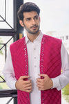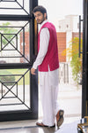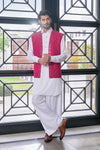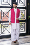 Step into graceful elegance with Pearl Magenta, a classic men’s ensemble featuring a pearl white short kurta paired with a farshi shalwar, complemented by a striking magenta waistcoat. Crafted in embroidered raw silk, the waistcoat is beautifully enhanced with mirrored embroidery, adding a festive statement. The short kurta and farshi shalwar are tailored in wrinkle-free poly cotton for comfort and ease, making this ensemble ideal for weddings, festive occasions, and formal gatherings.