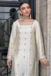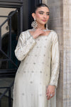 An embodiment of timeless elegance, this ivory ensemble features a long shisha silk shirt paired with straight capri pants and a crystal-embellished medium silk dupatta. The shirt is lavishly adorned with delicate handwork of dabka, gemstones, and pearls across its entirety, creating a graceful and luminous appeal. A classic choice for refined festive dressing and special occasions.