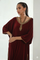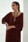 The Maroon velvet Kaftan is undeniably eye-catching for two compelling reasons: its distinctive cut and the striking embellishments adorning its neckline. The intricate handwork on the neckline is truly awe-inspiring, showcasing a captivating combination of kora, dabka, pearls, and stones that elevate the overall design.