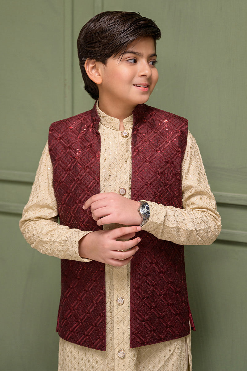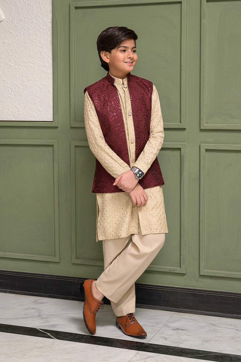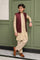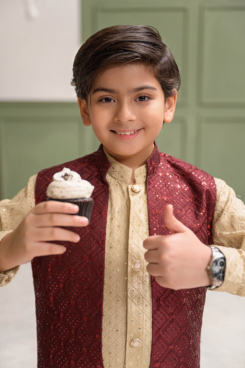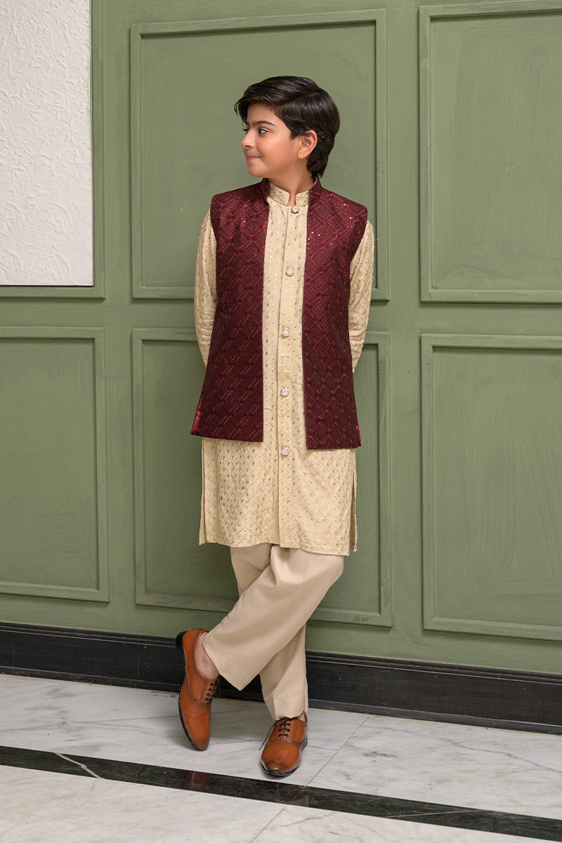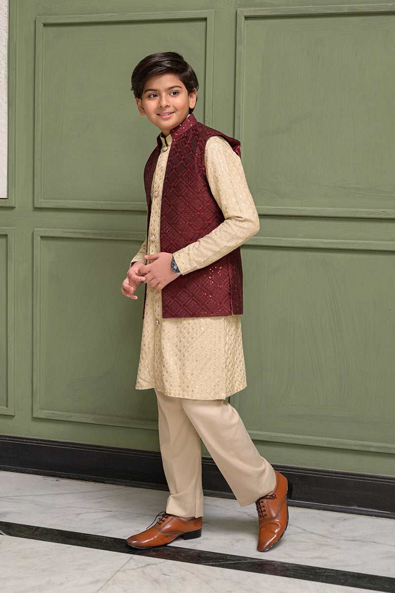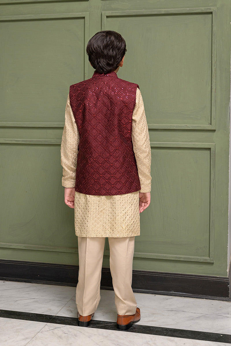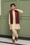 Step into timeless sophistication with Caramel Wine, featuring a maroon waistcoat crafted in embroidered raw silk and enhanced with delicate sequin detailing. Layered over a beige gold front-open raw silk kurta adorned with intricate sequin embroidery, this ensemble is paired with straight pants in wrinkle-free poly cotton fabric. A harmonious blend of rich hues and fine craftsmanship, perfect for festive occasions, weddings, and formal gatherings.