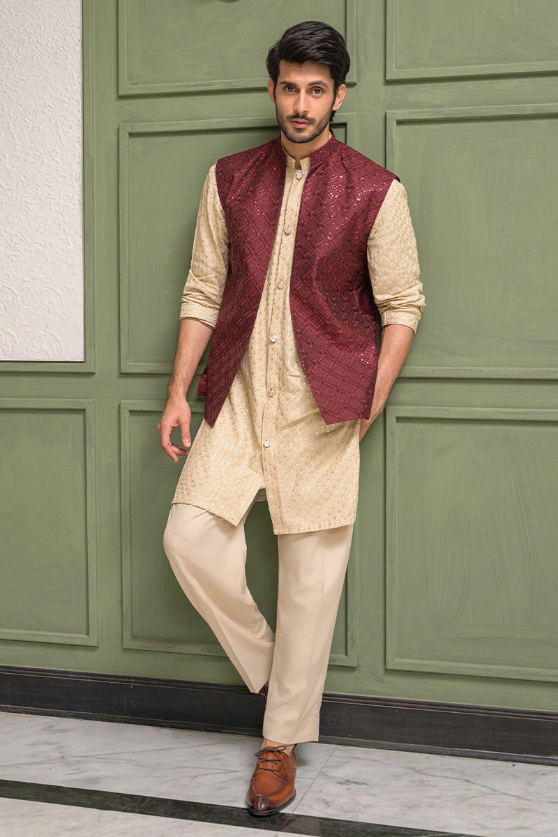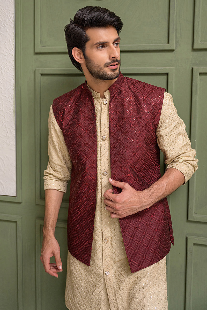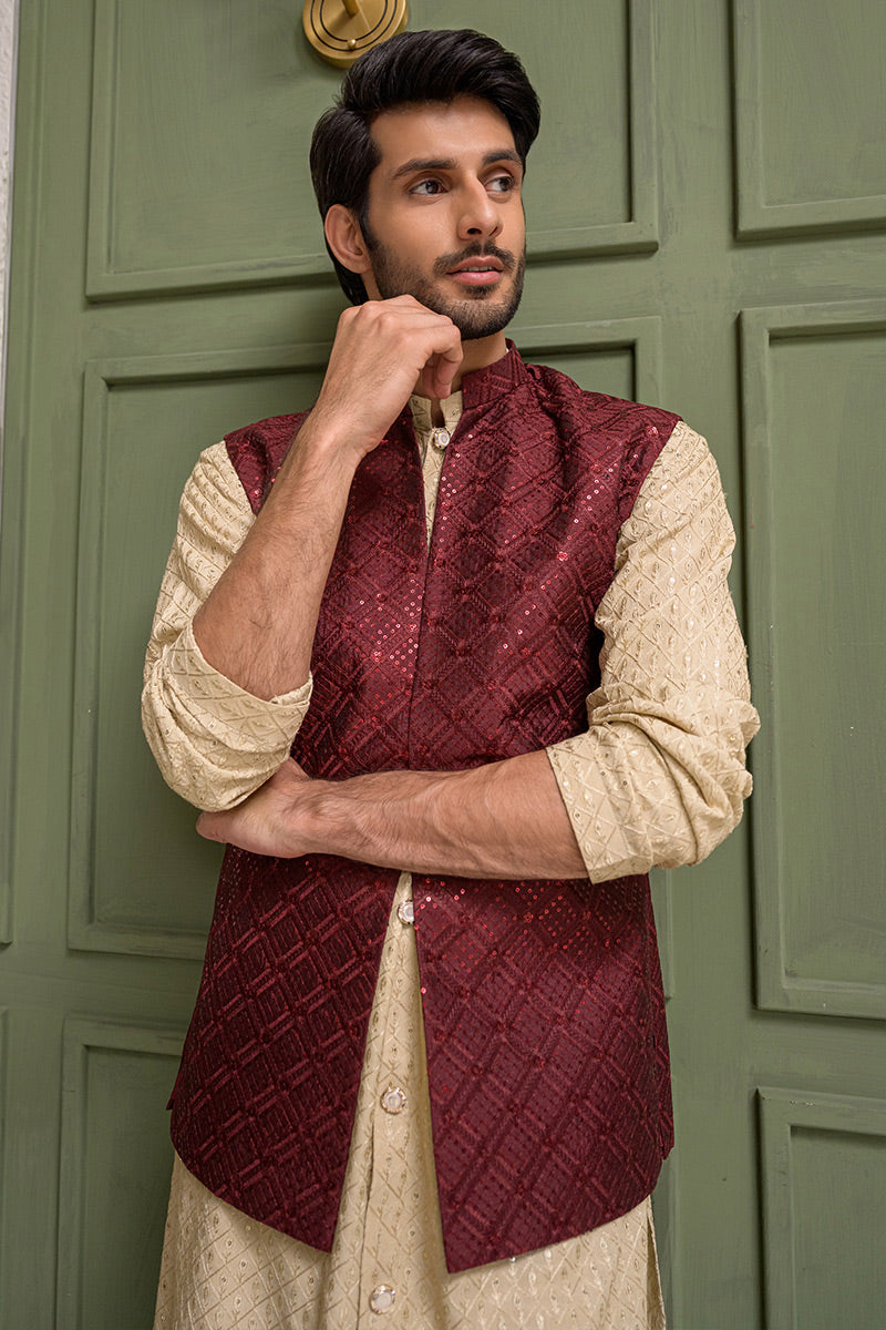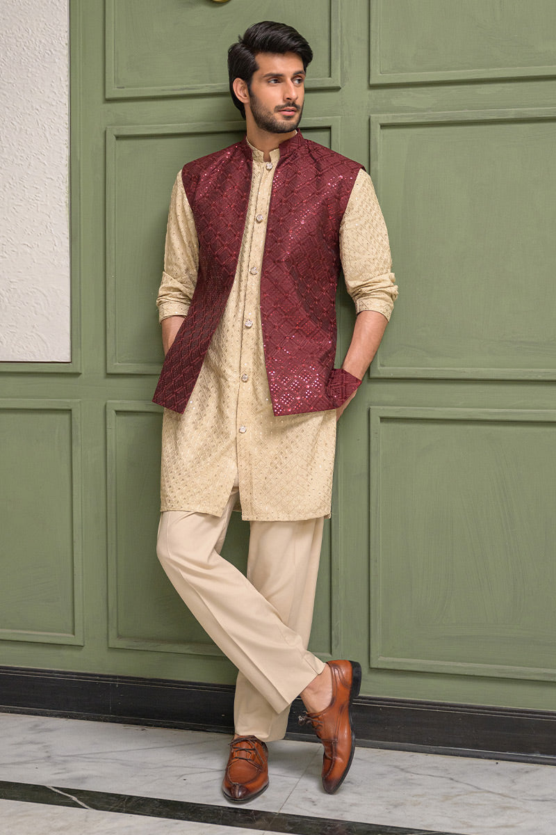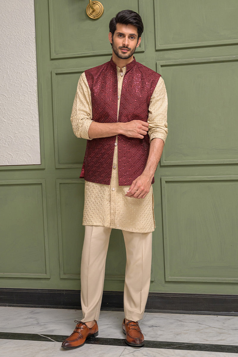 Step into timeless sophistication with Caramel Wine, featuring a maroon waistcoat crafted in embroidered raw silk and enhanced with delicate sequin detailing. Layered over a beige gold front-open raw silk...