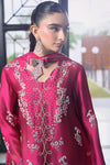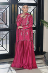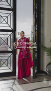 Step into festive elegance with this striking cherry magenta ensemble, designed with a short shisha silk shirt paired with a flowing kalidar trouser and a soft medium silk dupatta. The outfit is exquisitely hand-embellished with sequins, dabka, gemstones, and fine French knots, adding a luminous handcrafted charm. A delicate bow detail on the dupatta enhances its feminine appeal, making this ensemble an ideal choice for celebrations.