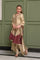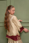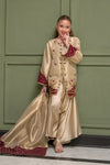 Shine in this opulent skin gold ensemble, featuring an intricately embellished jacket layered over an inner, paired with silk box pants and a zari tissue dupatta adorned with maroon rosy appliqués. Crafted in skin gold zari khadi fabric, the jacket is beautifully enhanced with maroon appliqué details and adorned with exquisite handwork of pearls, kora, dabka, crystals, stones, gems, and sequins. Delicate rose motifs grace the hem and back of the jacket, with further embellishment on the sleeves and neckline, creating a statement of timeless elegance.