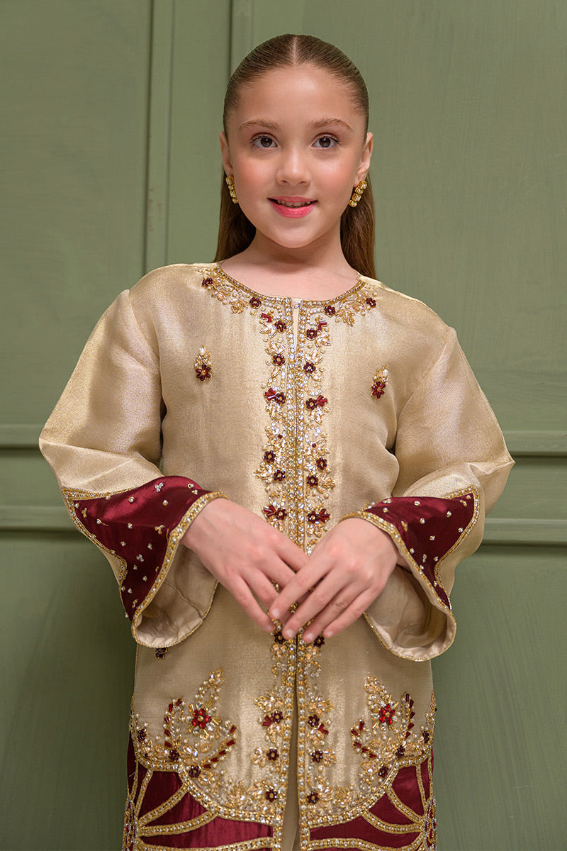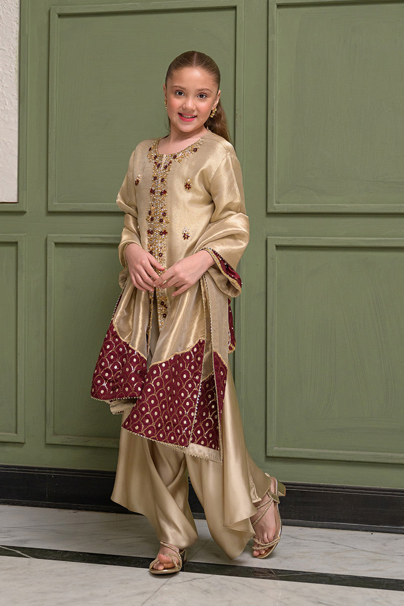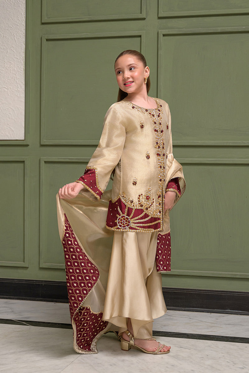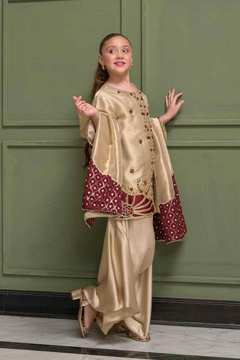 Fabric: Khaadi Zari Net (Jacket), Silk (Box Pants), Organza Zari Tissue with Maroon Appliqués (Dupatta)