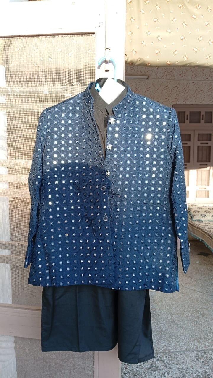 Introducing an elegant ensemble featuring a prince coat made from embroidered raw silk, complemented by a self viscose cotton shirt and matching pants. This outfit combines sophistication and comfort, making it ideal for formal occasions. The intricate embroidery on the coat adds a luxurious touch, while the self viscose cotton fabric ensures a soft and polished appearance.