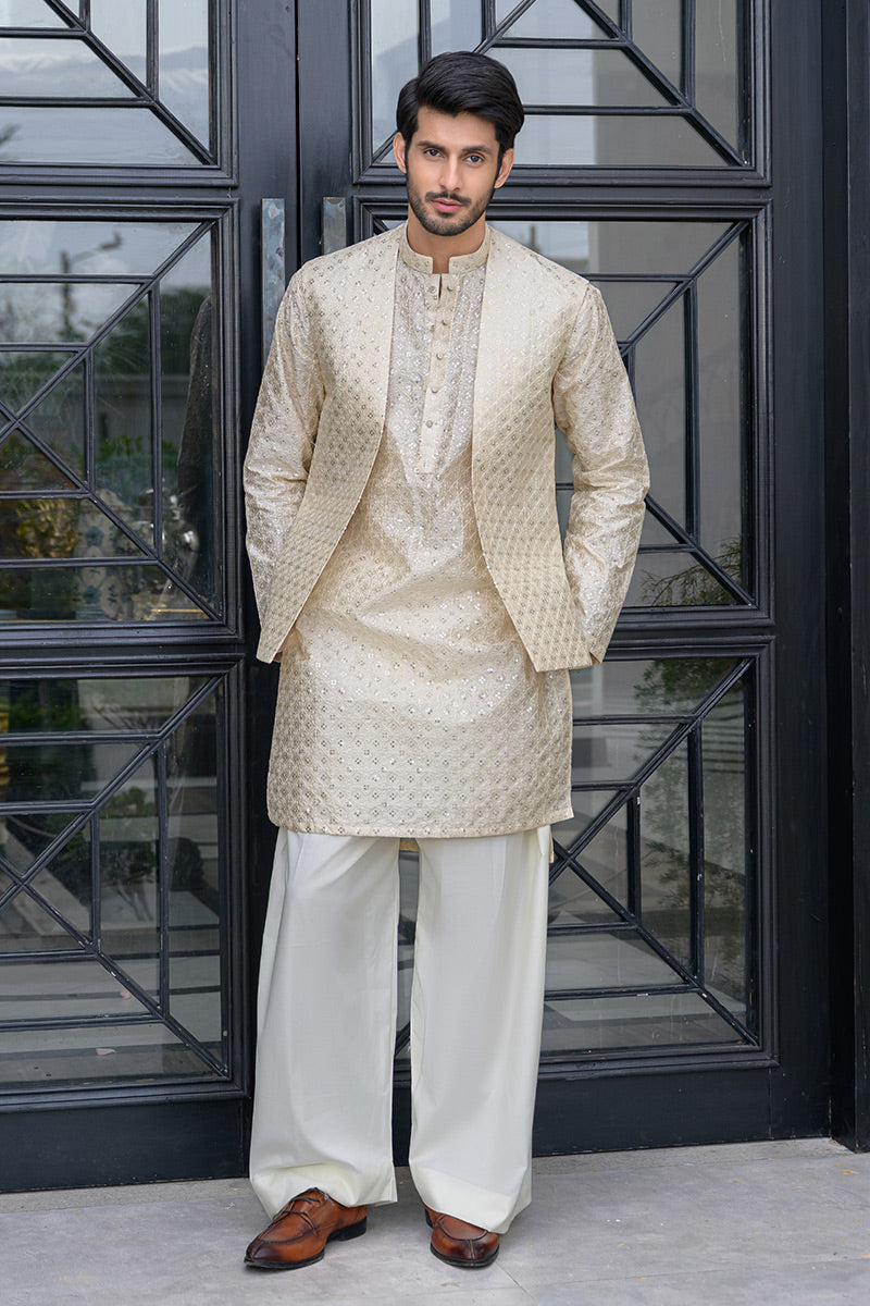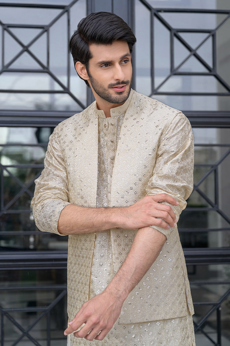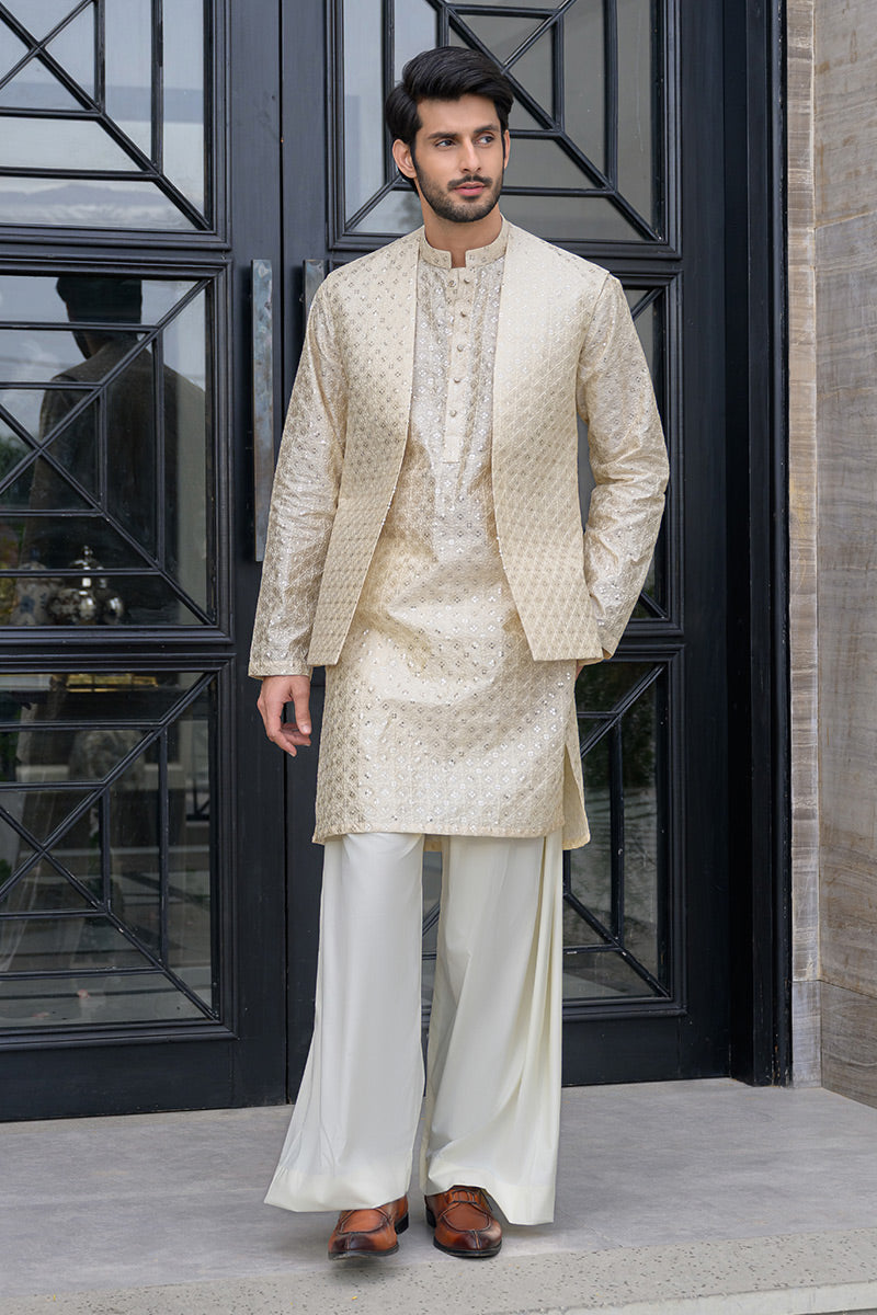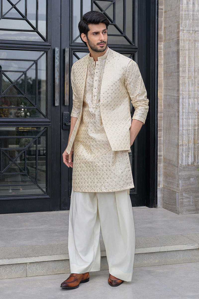 Step into regal elegance with Ivory Royal, featuring an embroidered raw silk kurta adorned with delicate sequin embroidery, paired with a matching raw silk waistcoat crafted in the same refined detailing. The ensemble is completed with a farshi shalwar tailored in wrinkle-free poly cotton, offering comfort with sophistication. A timeless choice for weddings, festive occasions, and formal gatherings.
