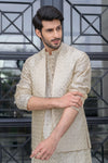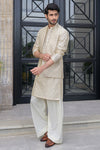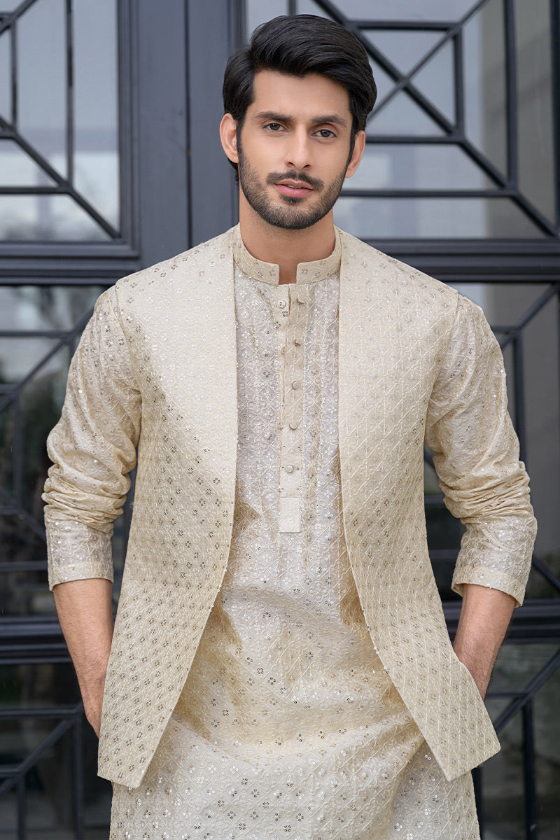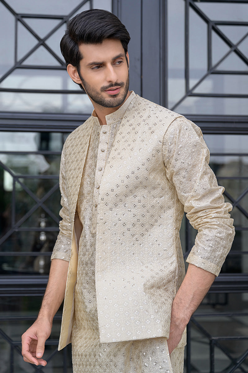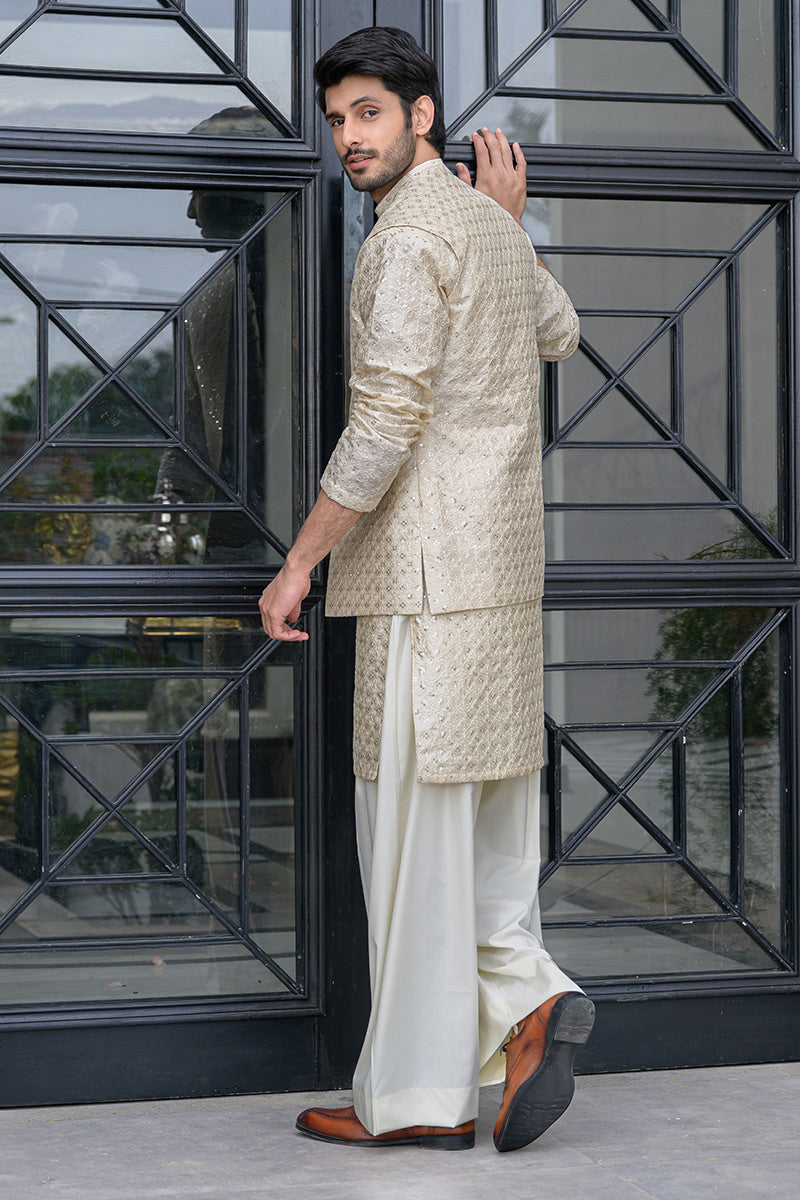 Step into regal elegance with Ivory Royal, featuring an embroidered raw silk kurta adorned with delicate sequin embroidery, paired with a matching raw silk waistcoat crafted in the same refined detailing. The ensemble is completed with a farshi shalwar tailored in wrinkle-free poly cotton, offering comfort with sophistication. A timeless choice for weddings, festive occasions, and formal gatherings.