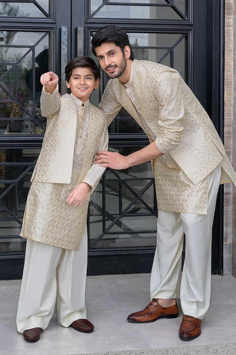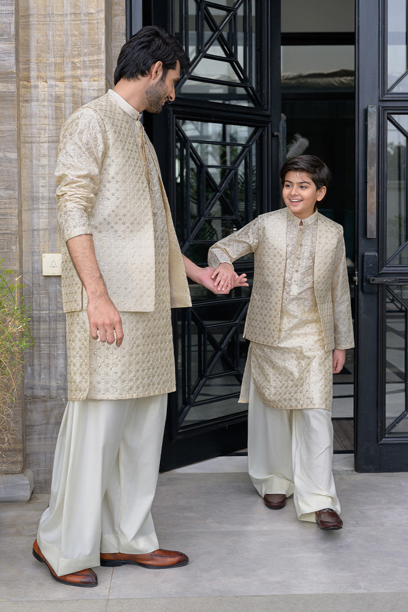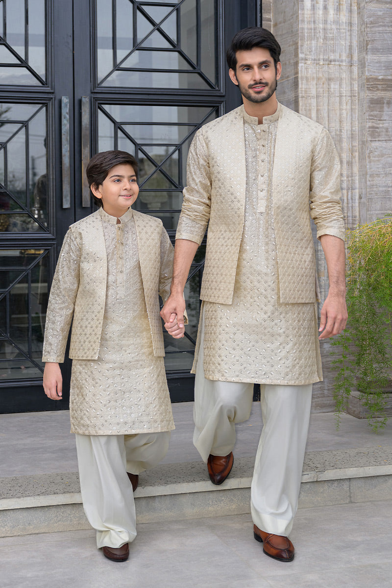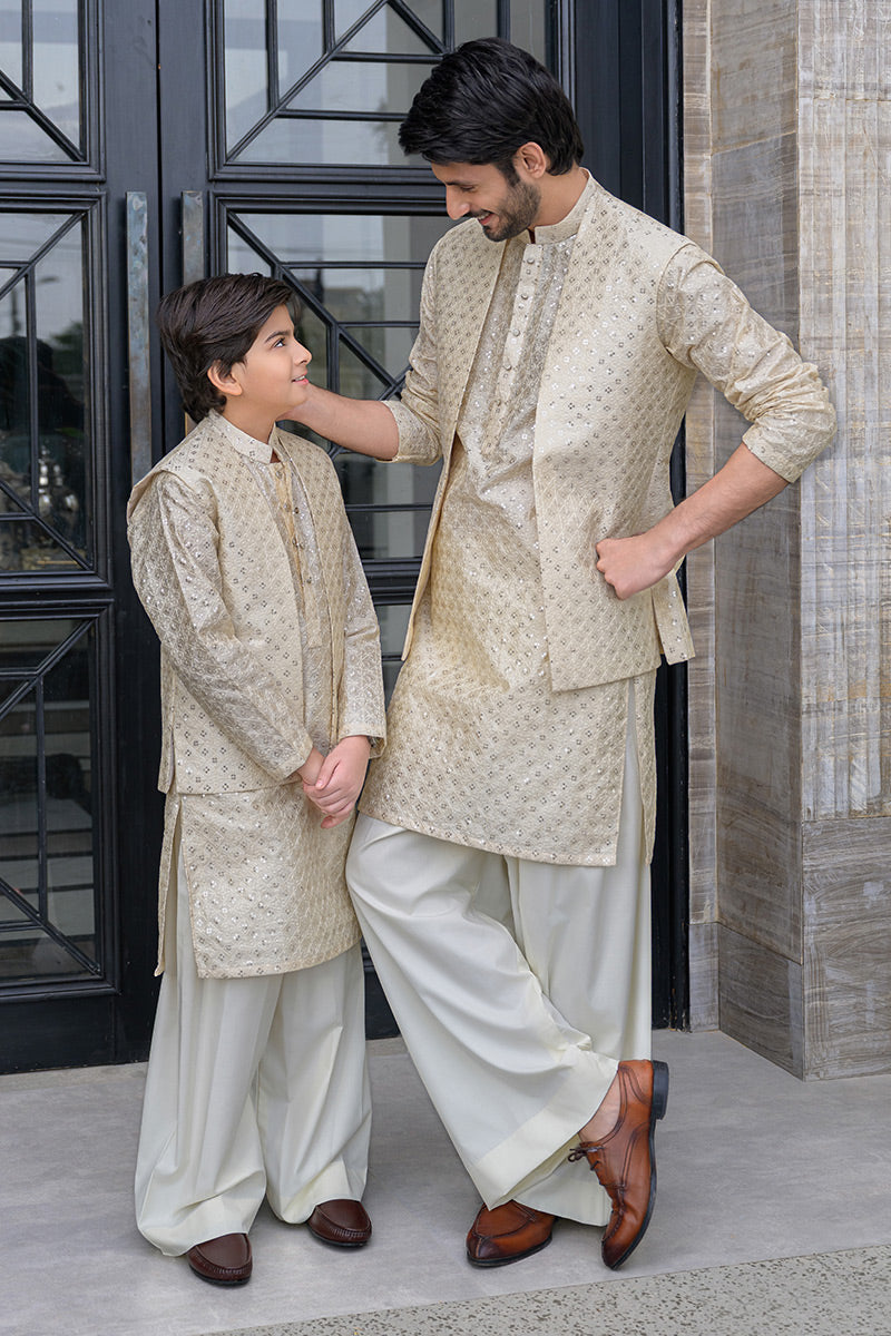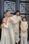 Step into regal elegance with Ivory Royal, featuring an embroidered raw silk kurta adorned with delicate sequin embroidery, paired with a matching raw silk waistcoat crafted in the same refined detailing. The ensemble is completed with a farshi shalwar tailored in wrinkle-free poly cotton, offering comfort with sophistication. A timeless choice for weddings, festive occasions, and formal gatherings.