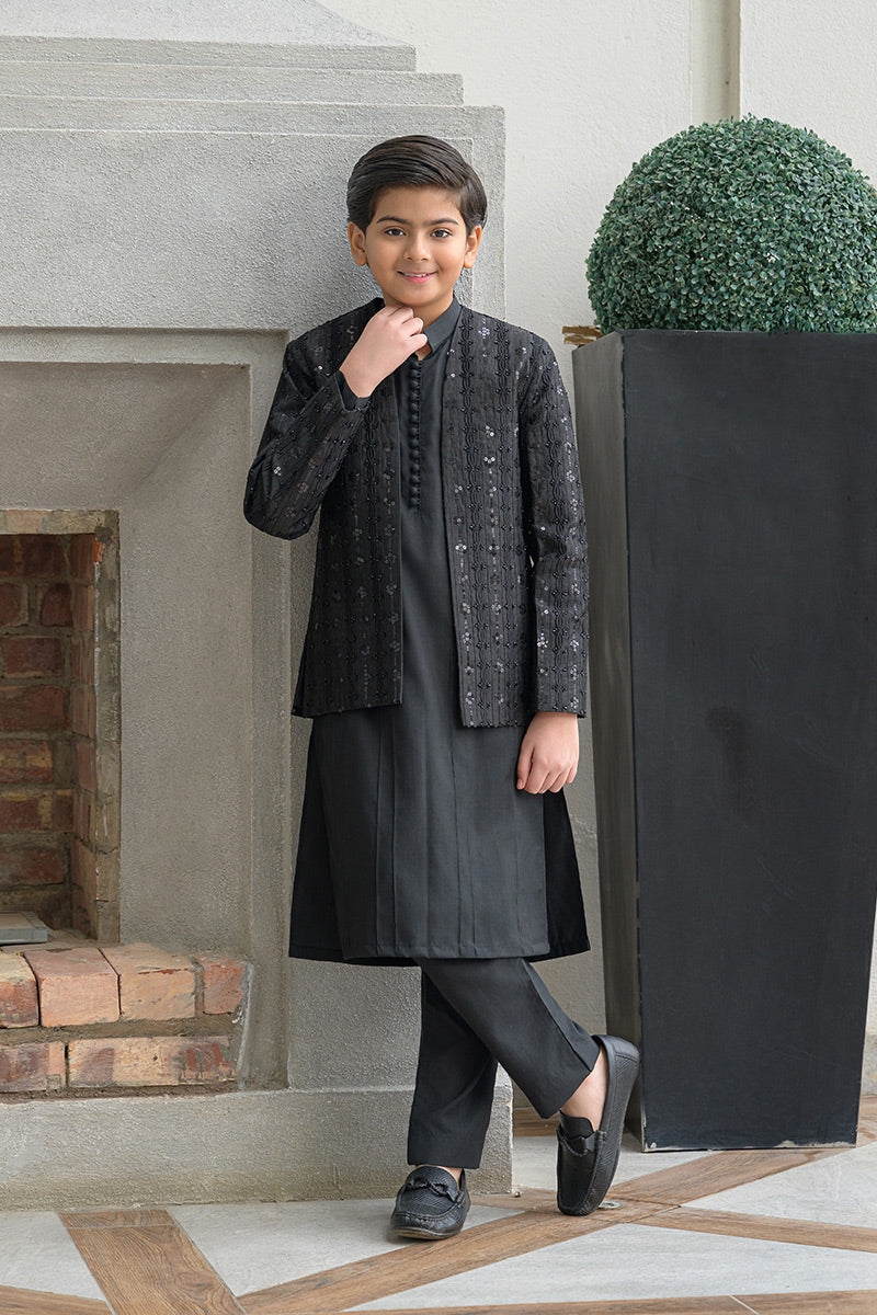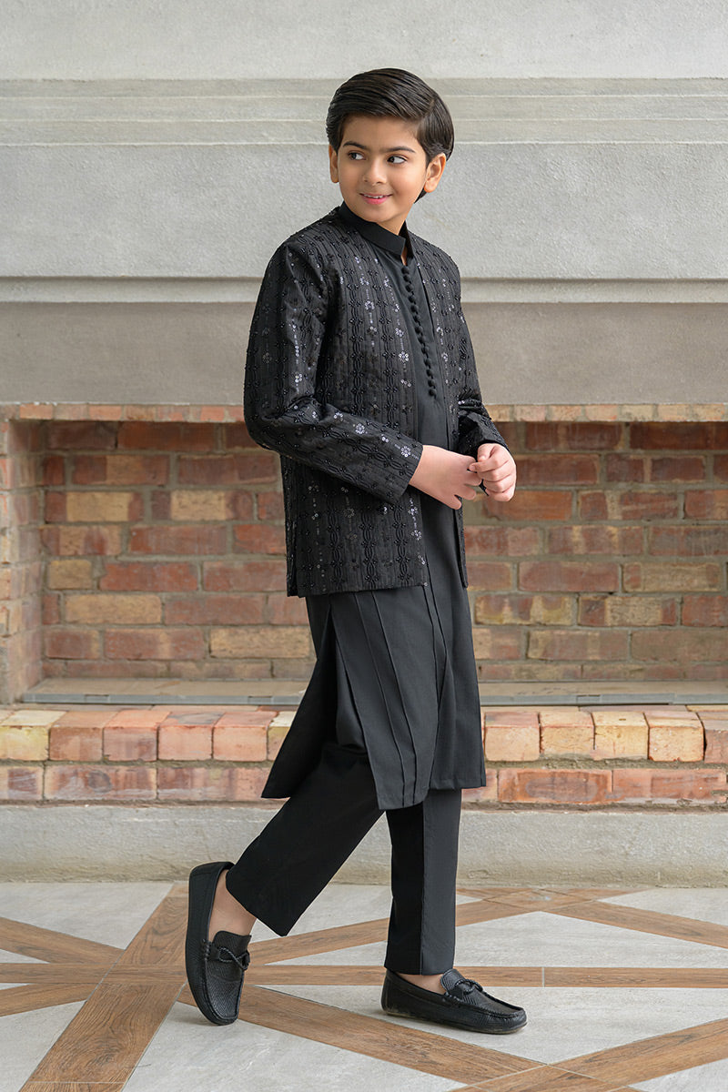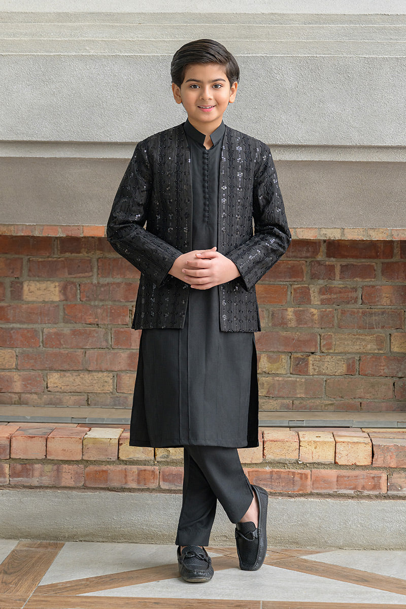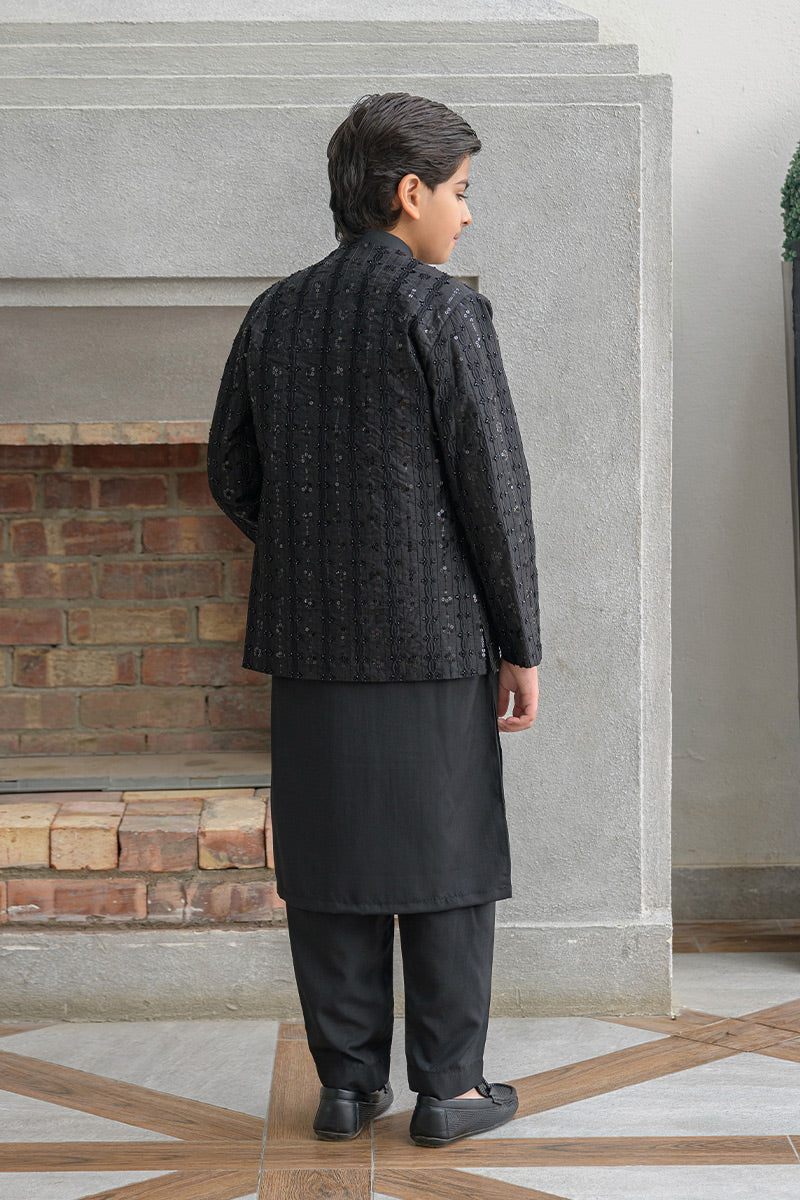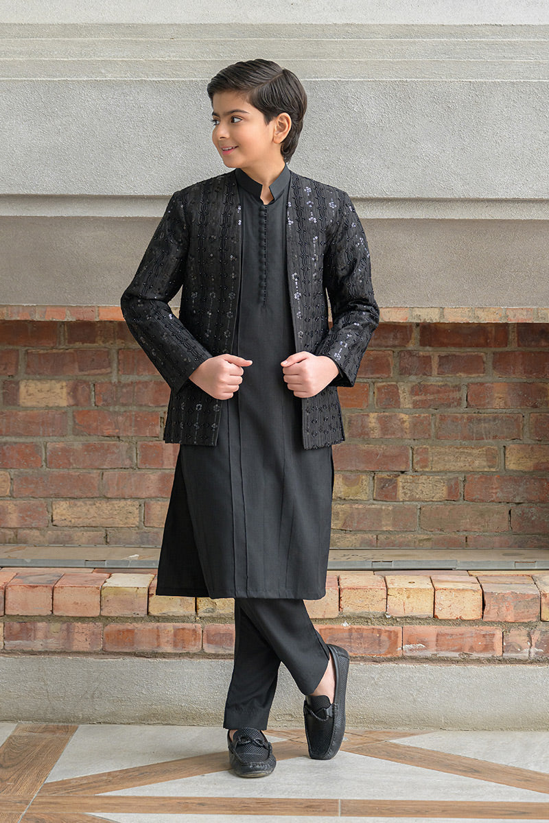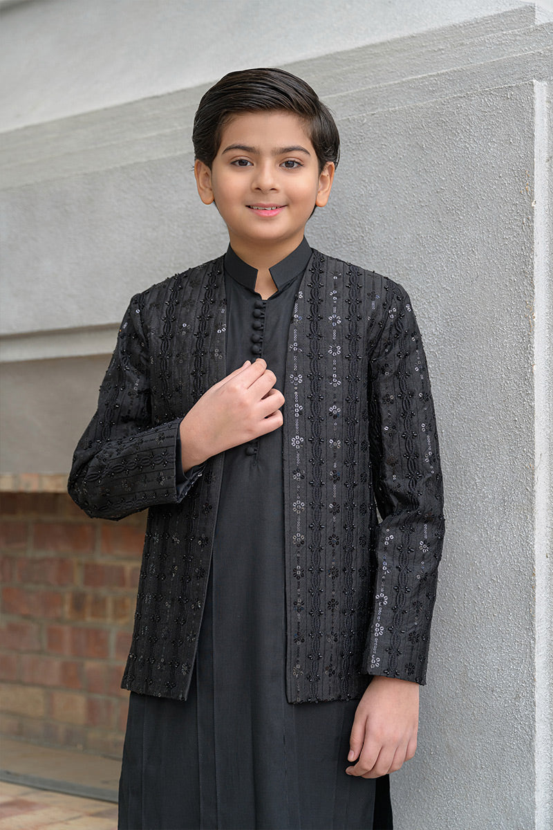 Step into timeless elegance with this classic black ensemble featuring a hand-embellished and embroidered raw silk prince coat layered over a wrinkle-free poly cotton shirt, paired with matching wrinkle-free poly cotton pants. The prince coat showcases refined craftsmanship with intricate embroidery and hand embellishment, making it an ideal choice for formal occasions, festive gatherings, and evening wear.
