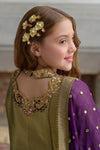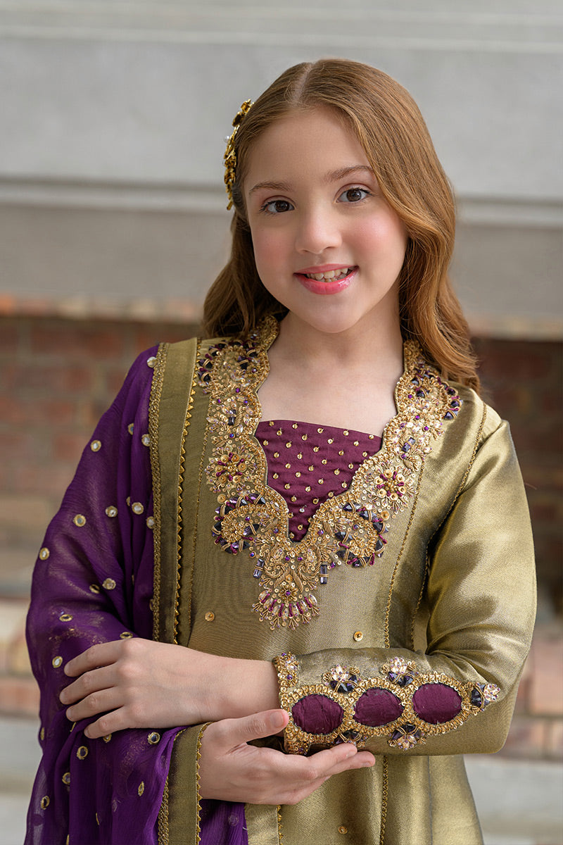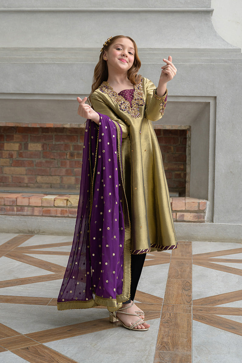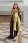Shine in this exquisite metallic gold-black ensemble, featuring a long kalidar frock paired with straight capri pants and a rich brinjal plum booti chiffon dupatta. Crafted from pure lama silk, the frock is adorned with intricate handwork of stones, gems, zardozi, resham embroidery, and shimmering sequins, creating a luminous and regal appeal. The contrasting plum dupatta adds depth and elegance—perfect for festive occasions
