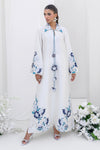 Float into elegance with Ocean Pearl—a long, off-white kaftan crafted in pure shisha silk. The collar, sleeves, hem, and daman are adorned with appliquéd embroidery in shades of light blue, sea green, navy, and off-white cutwork, further enhanced with delicate hand-applied Swarovski crystals and pearls. It features statement tassels with 3D floral details, intricately embellished with Swarovski crystals and pearls for a truly luxurious finish. Paired with capri pants featuring an organza patch, this ensemble exudes timeless sophistication for festive and evening occasions.