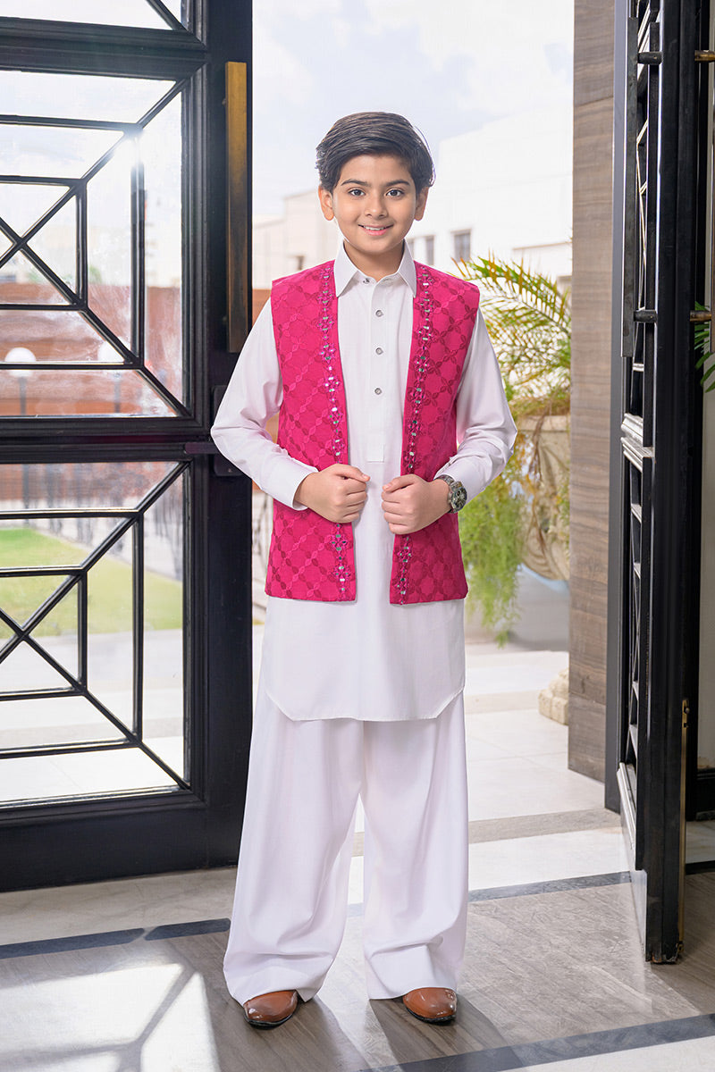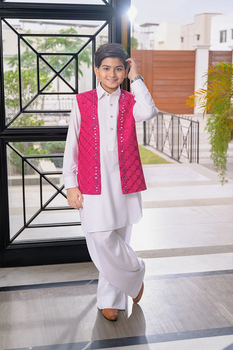 Step into graceful elegance with Pearl Magenta, a classic men’s ensemble featuring a pearl white short kurta paired with a farshi shalwar, complemented by a striking magenta waistcoat. Crafted in...