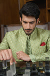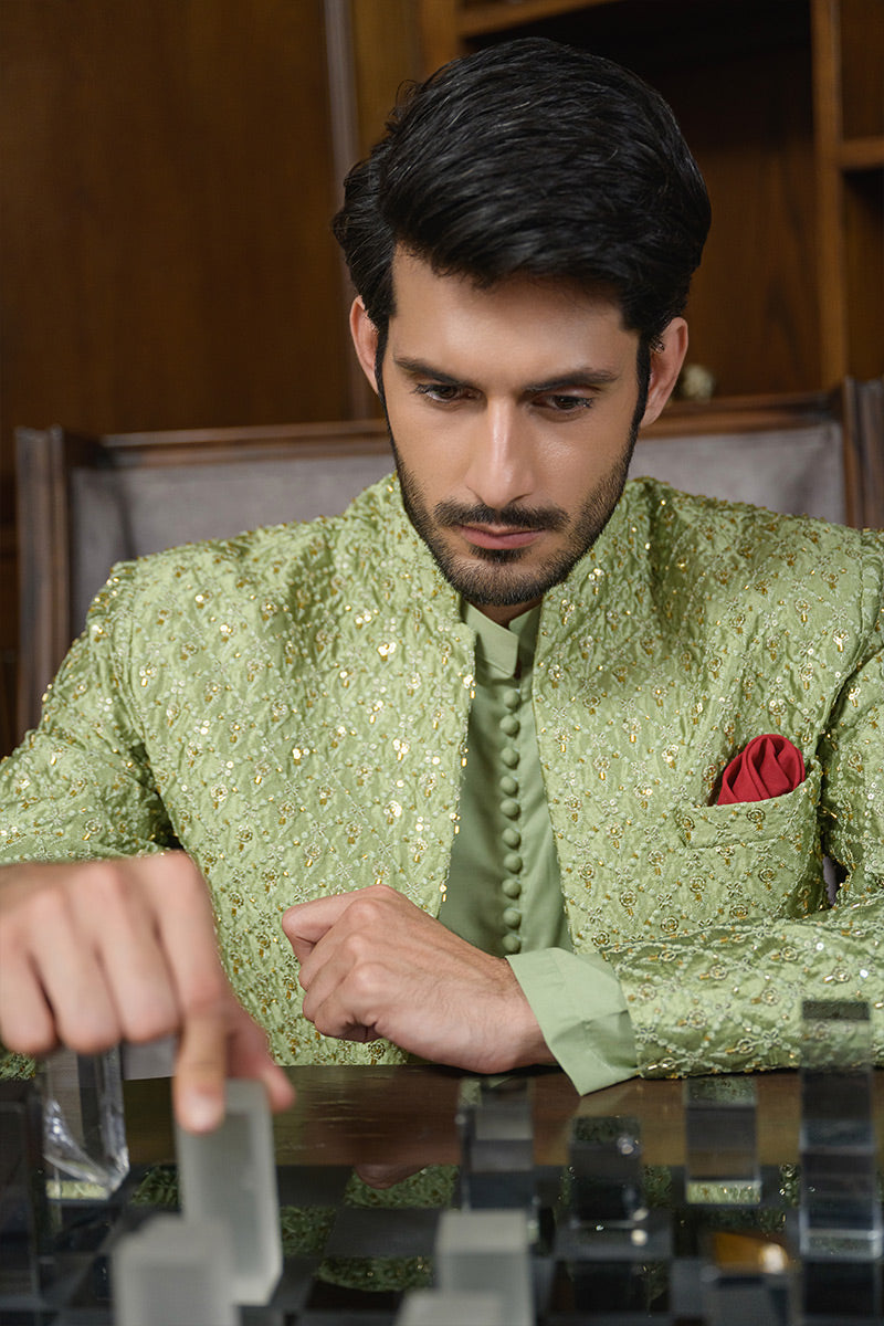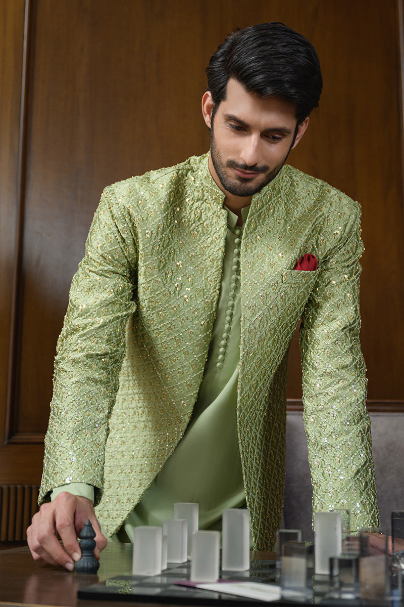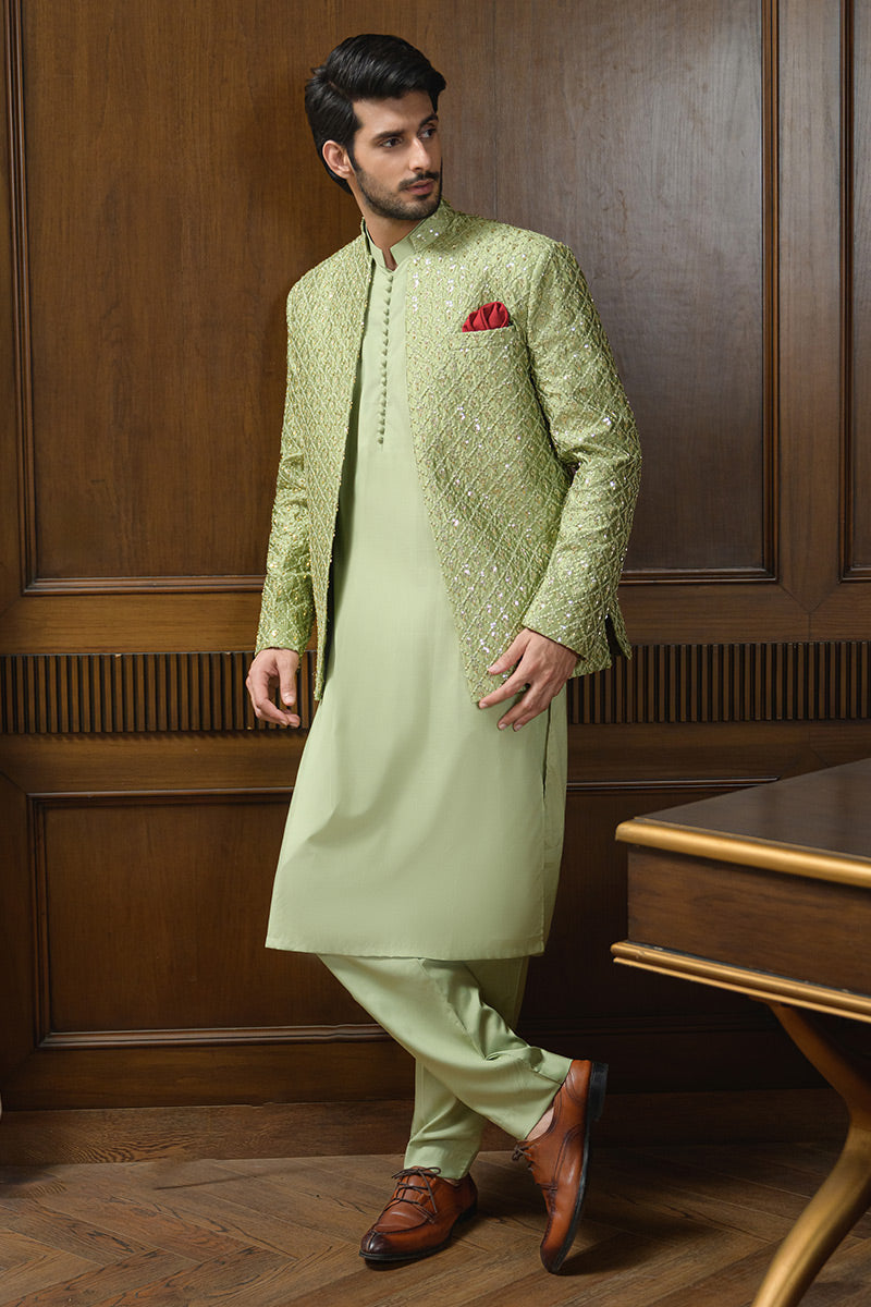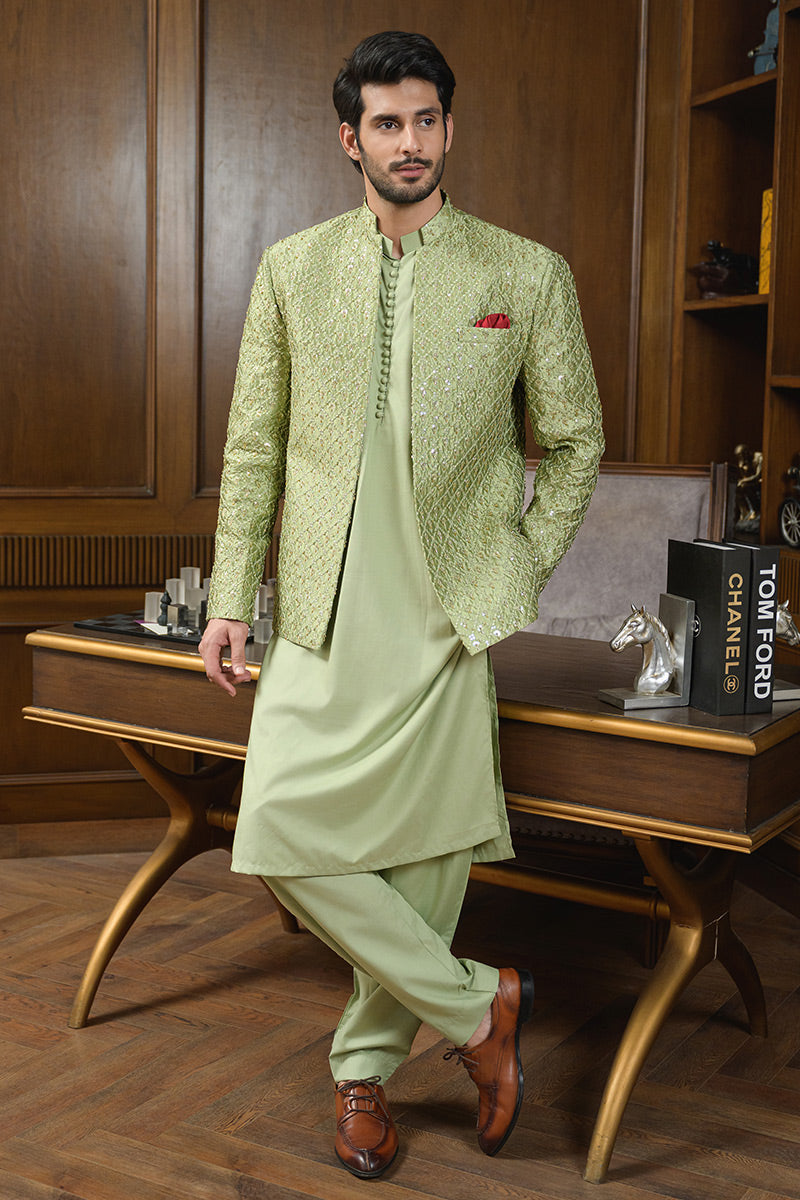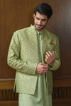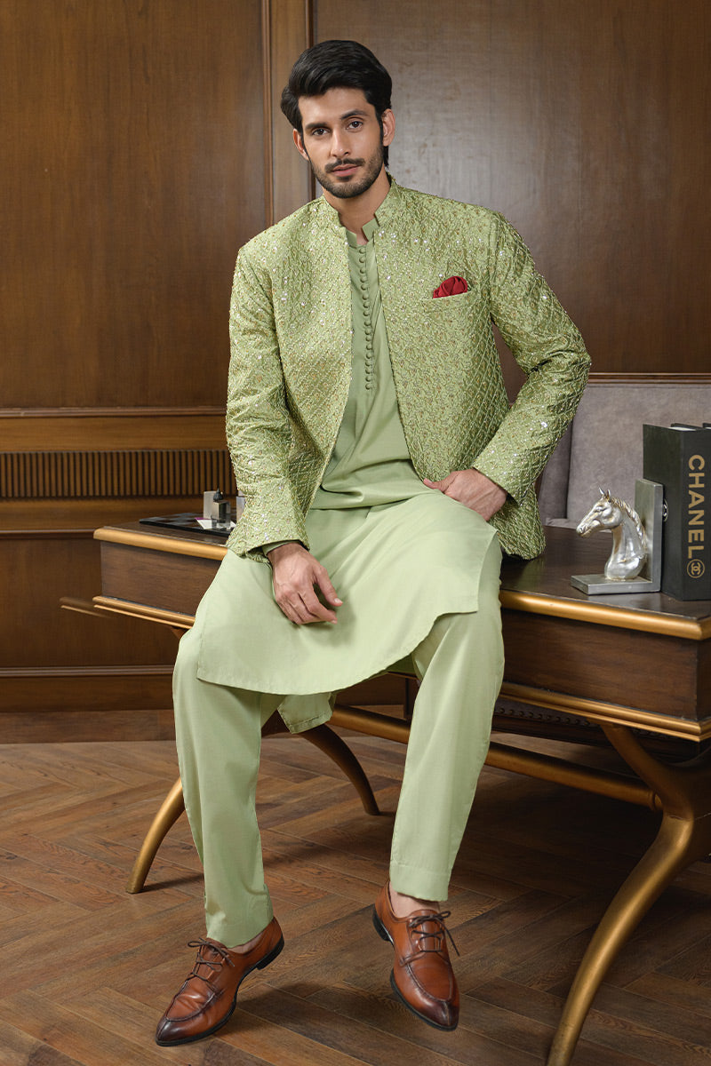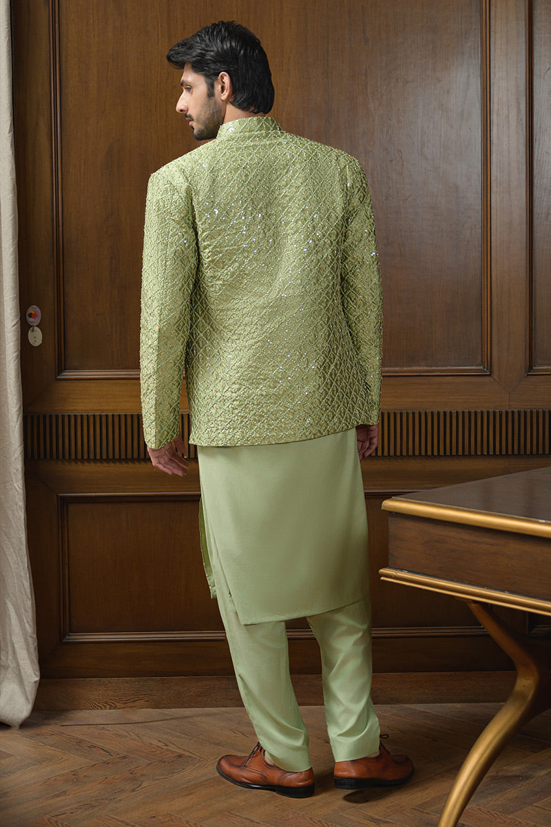 Step into refined elegance with this pistachio green ensemble featuring a hand-embellished and embroidered raw silk prince coat layered over a wrinkle-free poly cotton shirt, paired with matching wrinkle-free poly cotton pants. The prince coat is crafted with intricate detailing that elevates the look, making it a sophisticated choice for festive occasions, formal gatherings, and evening wear.