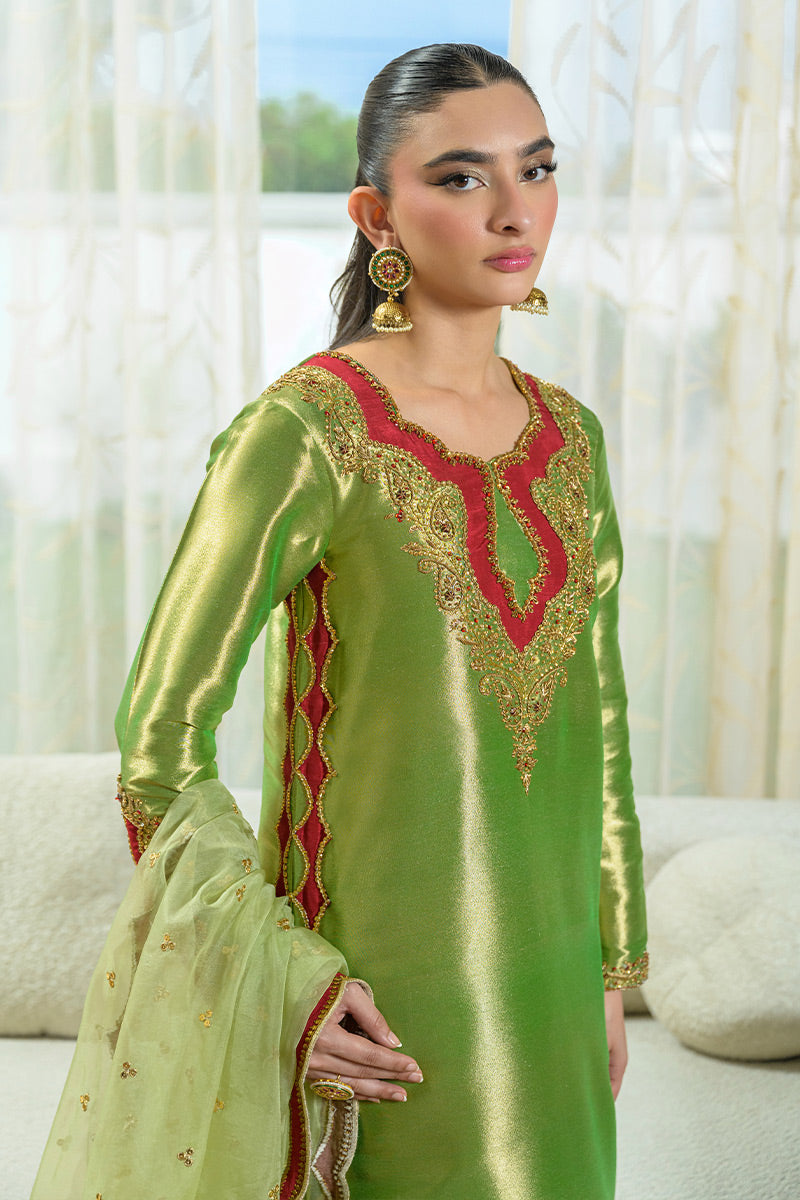 Shine in this graceful pistachio green ensemble, featuring a long shirt paired with lace-detailed izhar and an appliqued embroidered organza dupatta with contrast borders. Crafted in pure lama silk, the...